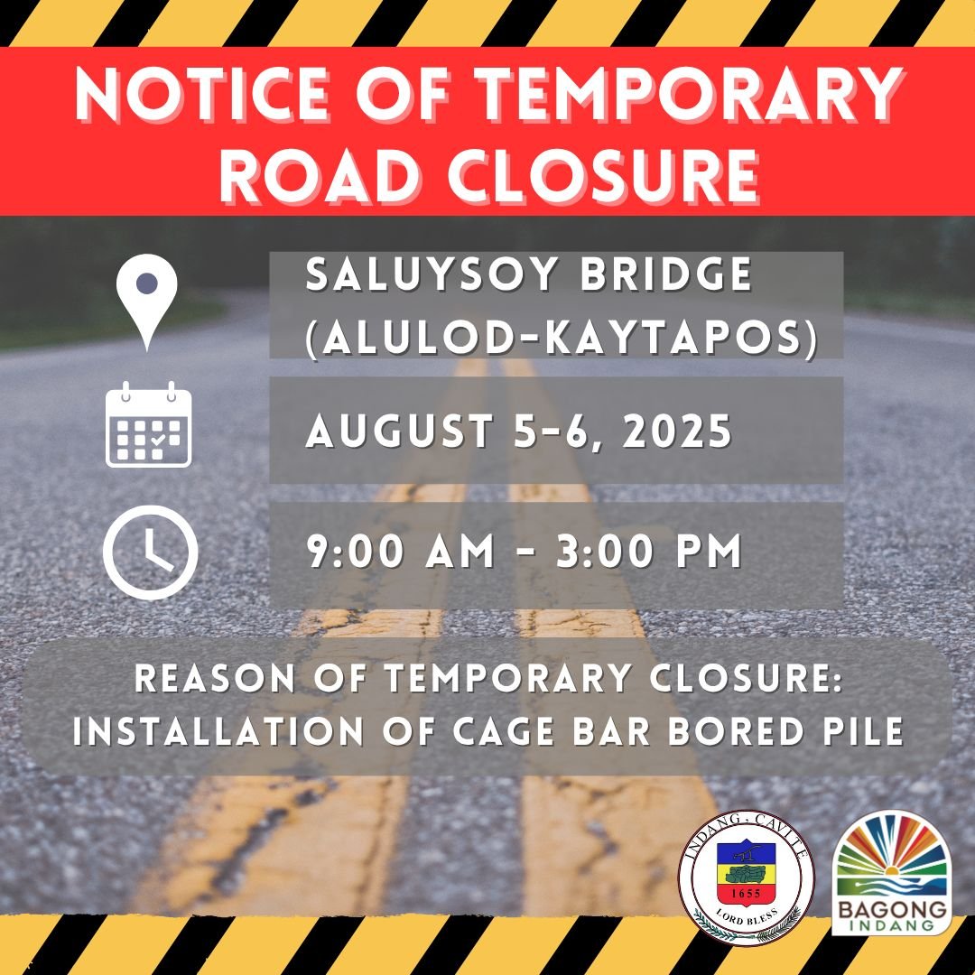 Ipinaaalam po sa lahat na ang Tulay ng Saluysoy na nag-uugnay sa Barangay Alulod at Kaytapos ay pansamantalang isasara sa mga sumusunod na petsa at oras: